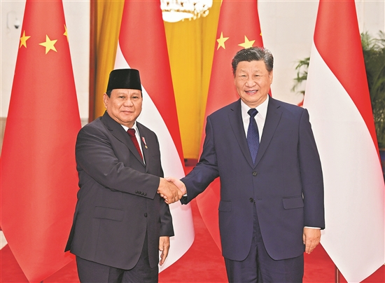 11月9日下午,國家主席習近平在北京人民大會堂同來華進行國事訪問的印度尼西亞總統普拉博沃舉行會談。這是習近平同普拉博沃握手。新華社記者 謝環馳 攝