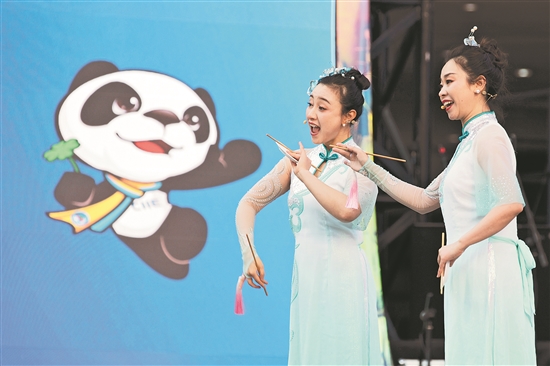 11月7日,在人文交流文藝表演舞臺上,來自四川的表演嘉賓正在表演“非遺”曲藝——四川盤子。