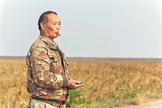 圖為11月12日,金偉國在上海崇明東灘鳥類國家級自然保護(hù)區(qū)吹鳥哨。