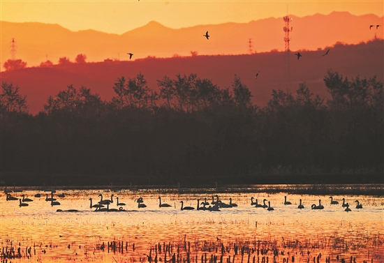 近日,天鵝在河北省張家口市懷來縣官廳水庫國家濕地公園棲息覓食。