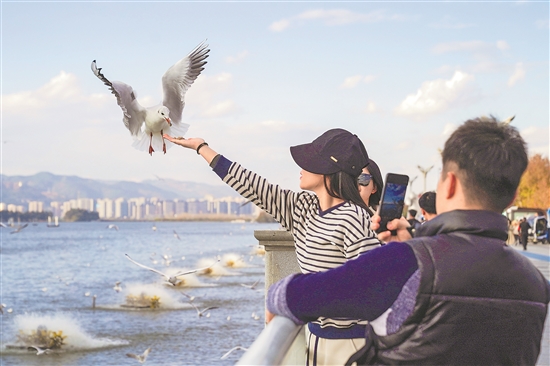11月20日,游客在昆明市海埂大壩上投喂紅嘴鷗。