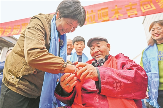 11月16日,扎拉嘎木吉給姐姐戴上他從內(nèi)蒙古帶來的手鐲。江蘇省南京市溧水區(qū)洪藍(lán)街道村民杭巧云迎來了闊別64年的弟弟扎拉嘎木吉。