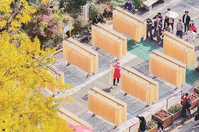 11月23日,浙江省湖州市長興縣小浦鎮大岕口村,村民在千年銀杏樹下晾曬銀杏面,吸引大量游客前來拍照賞景。