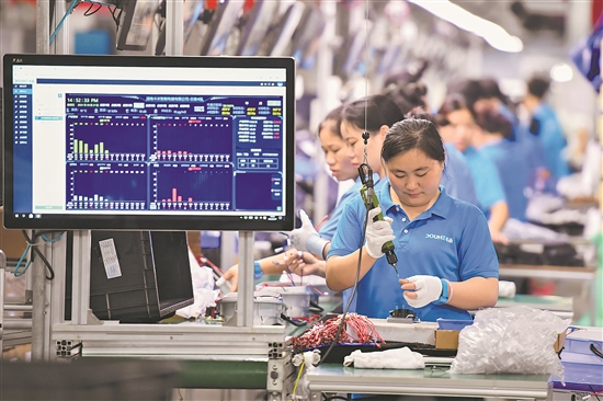 圖為工作人員在位于寧鄉(xiāng)市金洲新城的湖南斗禾智能電器有限公司生產(chǎn)線上作業(yè)。新華社記者 陳澤國 攝