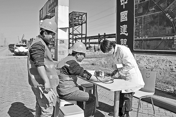 圖為建筑工人在醫(yī)護人員幫助下使用流動簡易醫(yī)療箱監(jiān)測血壓,保證健康上崗。本報通訊員 紀永奇 攝