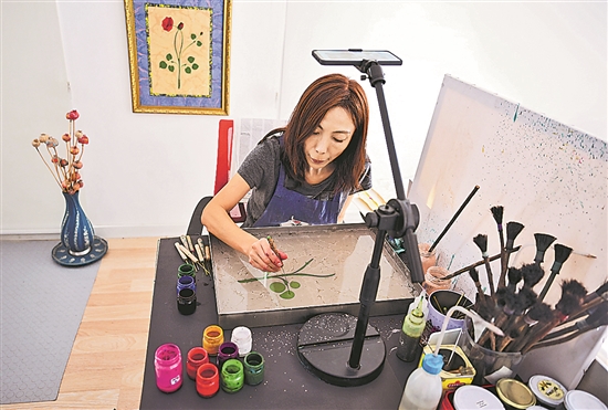 土耳其水拓畫是一種“水上作花、紙拓成畫”的古老繪畫技藝,2014年被聯(lián)合國教科文組織列入世界非物質(zhì)文化遺產(chǎn)名錄。2007年,在西安長大的李昕桐定居土耳其伊斯坦布爾,并開始學(xué)習(xí)水拓畫。她不斷嘗試將水拓畫與中國元素相結(jié)合,將水拓畫拓在中式服飾、絲扇、絲巾上,將絲路駝鈴、粽子、龍、福字等圖案做成水拓畫,并將作品展現(xiàn)給土耳其民眾。近年來,她時常往返中國和土耳其,開展講座和培訓(xùn),在中國傳授水拓畫技藝,為增進(jìn)中土兩國文化交流而努力。圖為近日,李昕桐在土耳其伊斯坦布爾的家中繪制水拓畫。