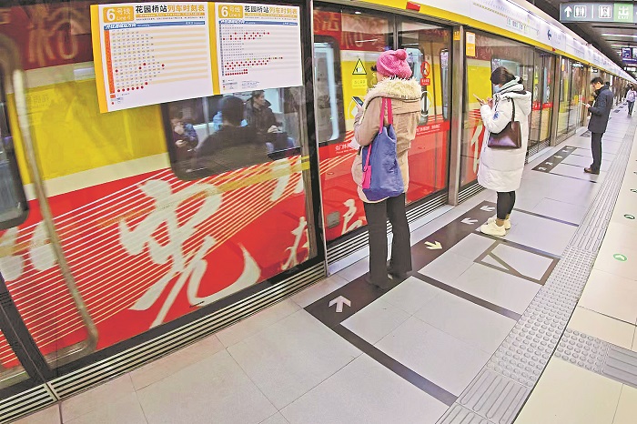 11月28日晚高峰期間,運行中的北京市憲法宣傳地鐵列車。