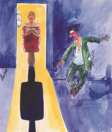 酒鬼大醉狼狽歸來,走到家門口頓時清醒。他想到妻子的橫眉冷對,孩子不屑的輕蔑,尤其是那根令人畏懼的搟面杖……