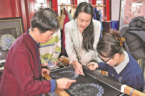 11月26日,金馨(右二)和于美英(左一)在北京指導學生刺繡。