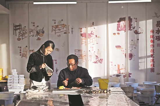 鄒天然一直在參與易水硯的創作和推廣,大學時就曾組織同學們來家鄉參觀、了解硯文化。2012年,她大學畢業后回到家鄉,為易水硯文化的傳承與發展注入了新活力。她創新設計的手把硯、文博文創硯等系列硯,在全國文房四寶藝術博覽會上獲得多枚金獎。新華社記者 金良快 攝