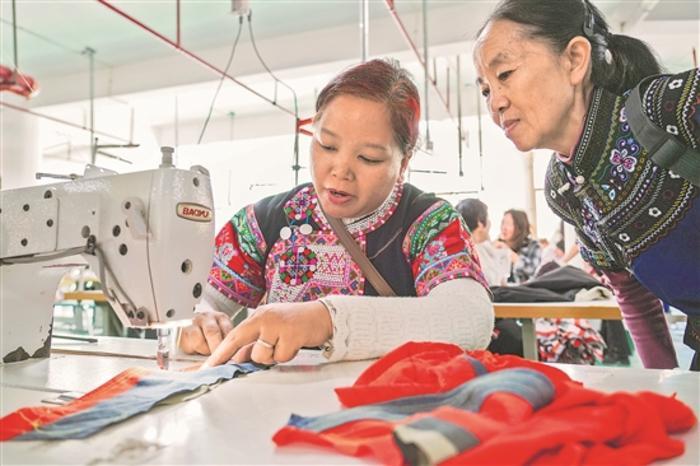 12月1日,元陽縣德熙紡織廠成品生產車間組長刀秀瓊(左)在由當地閑置停車場改造的生產車間里指導新員工工作。