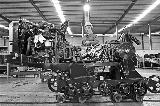 11月29日,在湖南郴州的農夫機電有限公司車間里,工人在裝配一臺拖拉機。