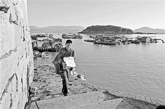 12月2日,在福建省寧德市蕉城區三都鎮蝦蕩尾村碼頭,郵遞員石進全為漁民送快遞。