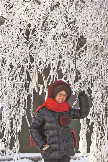 12月4日,吉林省吉林市烏拉街鎮韓屯村霧凇島景區,一名游客在霧凇下留影。霧凇島地勢較低,江水環抱,冷熱空氣交匯,冬季霧凇景觀奇美。作為國內最佳島嶼霧凇觀賞區,這里年接待游客約60萬人次。