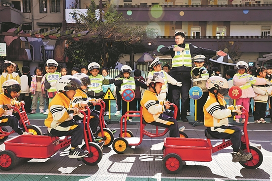 12月2日,浙江省湖州市德清縣,交警在模擬道路上指揮幼兒園的孩子“過馬路”,養成文明出行好習慣。本報通訊員 倪立芳 攝