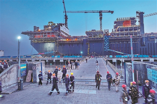 12月1日,江蘇省啟東市海工船舶工業園,一艘超大型“海上油氣處理工廠”正在建造中。夜幕降臨,下班的工人走出碼頭。