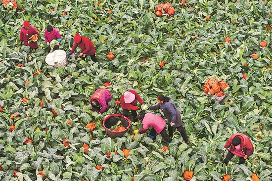 12月6日,江蘇省泰州市姜堰區,蔬菜生產基地內的農戶正在田間收花菜。這些新采摘的花菜經過分揀包裝后,將被運往周邊城市銷售。