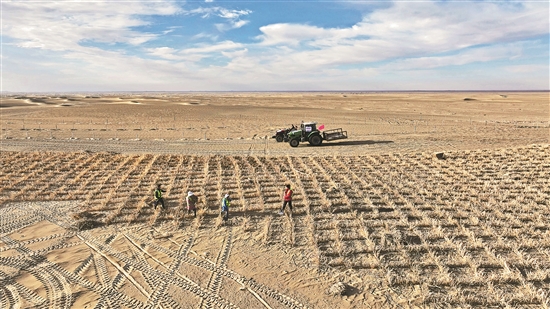 11月26日,新疆維吾爾自治區和田地區,塔克拉瑪干沙漠“鎖邊”工程進入沖刺階段。項目工作人員安裝由木桿、蘆葦等材料制成的綠色屏障。28日上午,邊緣長度約3046公里的中國最大沙漠成功“鎖邊”。