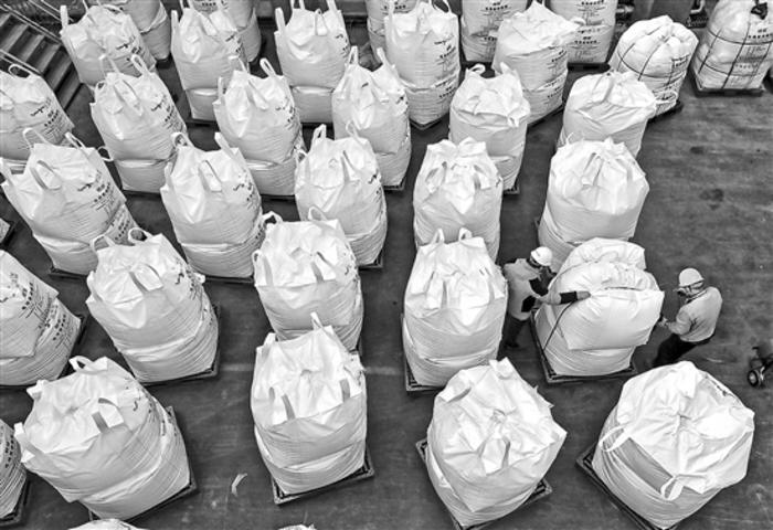 12月14日,在江西省萍鄉市湘東區拓源實業有限公司,工人正在對電池級碳酸鋰進行打包。碳酸鋰是制備鋰電池的重要原料。
