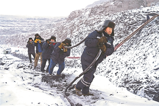 12月11日,氣溫降至零下26攝氏度,中煤華利和翔公司別斯庫都克露天煤礦坑下一級排水管發(fā)生凍堵卡水現(xiàn)象。由于坑下地形復(fù)雜,不適合大型機械設(shè)備操作,班組職工手拉肩扛,對排水管進行了更換和緊急架設(shè)。李磊 孫衛(wèi)東 攝