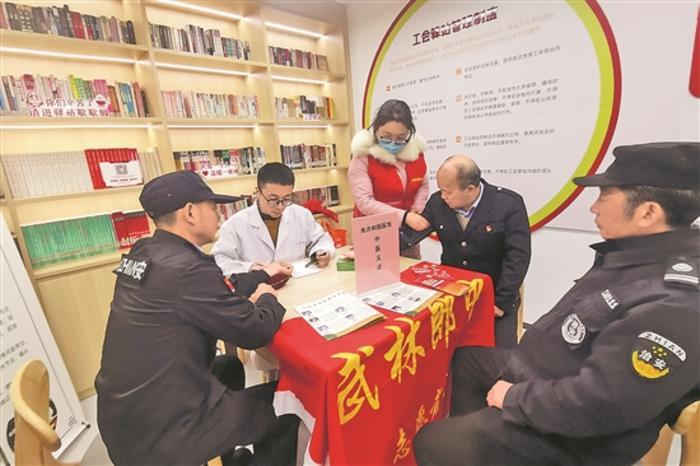 12月11日,浙江省杭州市天水街道倉橋社區,醫務志愿者正在工會驛站內為戶外勞動者義診。