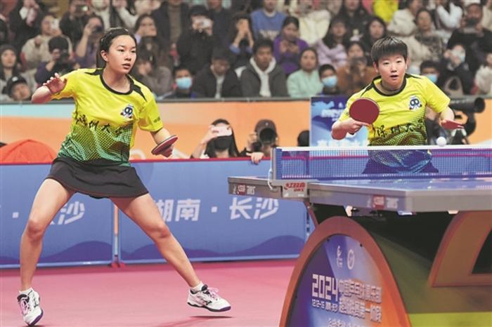 深圳大學(xué)隊(duì)組合孫穎莎(右)/吳詠琳在女子團(tuán)體雙打比賽中。新華社記者 薛宇舸 攝