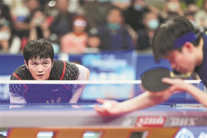 上海地產(chǎn)集團(tuán)隊(duì)選手樊振東(左)在單打比賽中。新華社記者 薛宇舸 攝