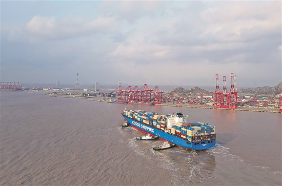 12月18日,“新上海”輪正在靠泊上海洋山港碼頭(無人機照片)。