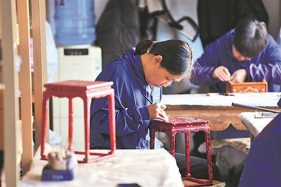 12月18日,河北省廊坊市廣陽區南漢村,宮廷藝術小鎮的“燕京八絕”非遺工坊內,工作人員正在制作雕漆工藝品。