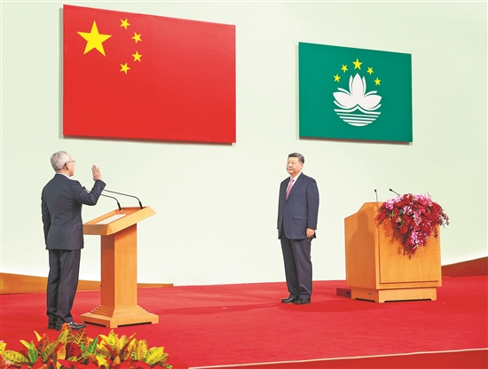 習近平出席并發表重要講話 澳門特別行政區第六任行政長官岑浩輝及特別行政區政府主要官員等宣誓就職 習近平指出,澳門回歸祖國25年來,具有澳門特色的“一國兩制”實踐取得巨大成功,澳門發生翻天覆地的變化,國際影響力大幅提升。希望新一屆澳門特別行政區政府團結帶領社會各界,搶抓機遇、銳意改革、擔當作為,更好發揮“一國兩制”制度優勢,不斷開創“一國兩制”事業高質量發展新局面