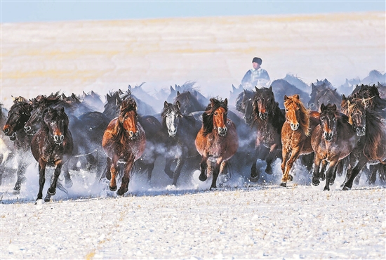 12月12日,東烏珠穆沁旗的牧民在雪原上馴馬。冬季內(nèi)蒙古錫林郭勒盟東烏珠穆沁旗的草原被白雪覆蓋,牧民趕著馬群在雪原上馴馬,為八方游客呈現(xiàn)了駿馬奔騰的壯觀景象。新華社記者 彭源 攝
