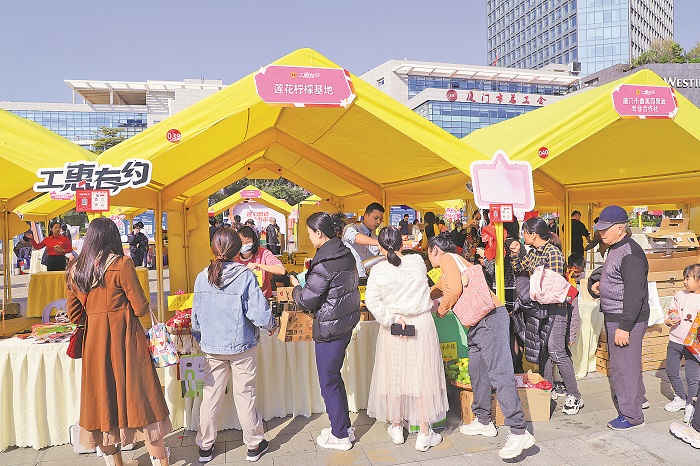 12月21日,由福建省廈門市總工會聯合多家單位共同舉辦的“雙愛同心 和諧共贏”工會會員服務日活動在廈門市工人文化宮舉行。全總廈門火炬高技術產業開發區蹲點干部、“雙愛典范”企業代表、新就業形態勞動者、愛心企業、特惠商戶等600人共赴工“惠”之約。112戶特惠商家入駐集市,為職工提供“衣、食、住、行、游、娛、購”全方位的消費服務。