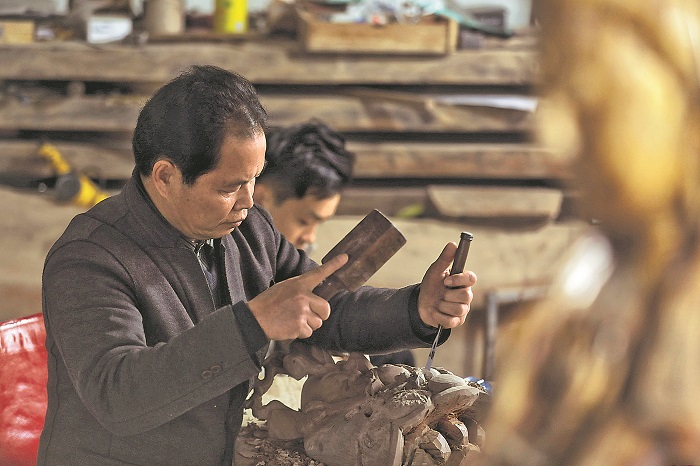 如何傳承與發展,是非物質文化遺產面臨的最大問題。彭國龍說,要在創作時融入自己對儺文化的理解,結合萍鄉和其他地方儺面具的特點,在繼承傳統的基礎上大膽創新。圖為近日彭國龍(左)、彭增協父子在自己的工作室雕刻儺面具。
