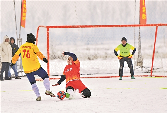 當(dāng)日,南北鄉(xiāng)村雪地足球邀請(qǐng)賽在吉林省舒蘭市小城鎮(zhèn)南陽村舉行。貴州省榕江縣的貴州村超隊(duì)從3000公里外遠(yuǎn)赴東北,與東道主吉林市豐滿區(qū)代表隊(duì)在冰天雪地中開展一場(chǎng)友誼賽。新華社記者 顏麟蘊(yùn) 攝