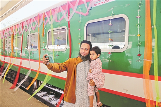 中國企業承建的孟加拉國最大鐵路項目帕德瑪大橋鐵路連接線近日全線通車,正式運營。作為標志性“一帶一路”共建項目,這條被當地人稱為“夢想之路”的鐵路全線長約170公里。通車后,首都達卡到西南部城市杰索爾的通行時間將由原來的10小時縮短至3小時。同時,該鐵路將有力促進沿線地區經濟發展。圖為近日,在孟加拉國首都達卡,人們在帕德瑪大橋鐵路連接線列車前自拍。新華社發(拉赫曼 攝)