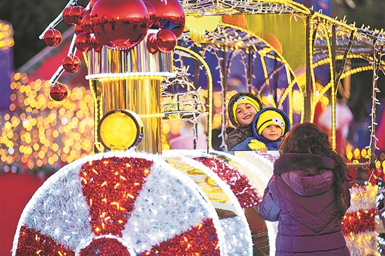圖為當地時間12月25日,在意大利羅馬博爾蓋塞公園,小朋友與彩燈裝飾合影。