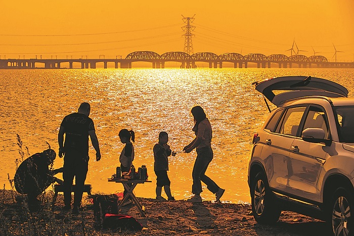 4月20日,河北省懷來縣官廳水庫邊,游客們沐浴在夕陽下。官廳水庫是新中國成立后建設的第一座大型水庫。近年來,當地圍繞官廳水庫發展生態旅游,吸引不少游客前來“打卡”。本報記者 王偉偉 攝