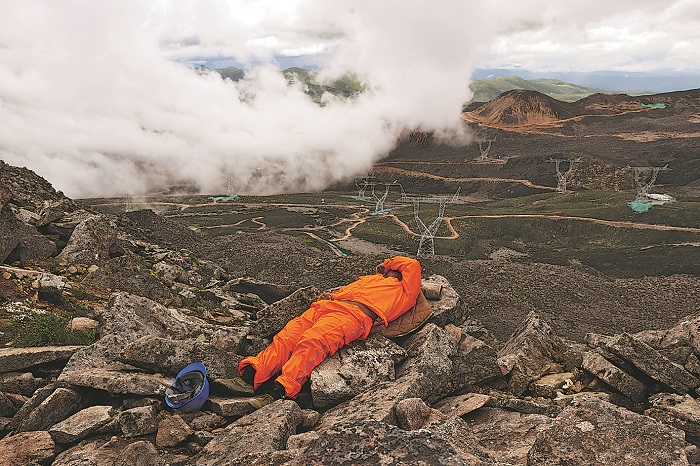 7月16日,在四川康定川渝1000千伏特高壓交流工程線路工程施工現場,一名工人在海拔4600多米的山頂午休。本報記者 吳凡 攝