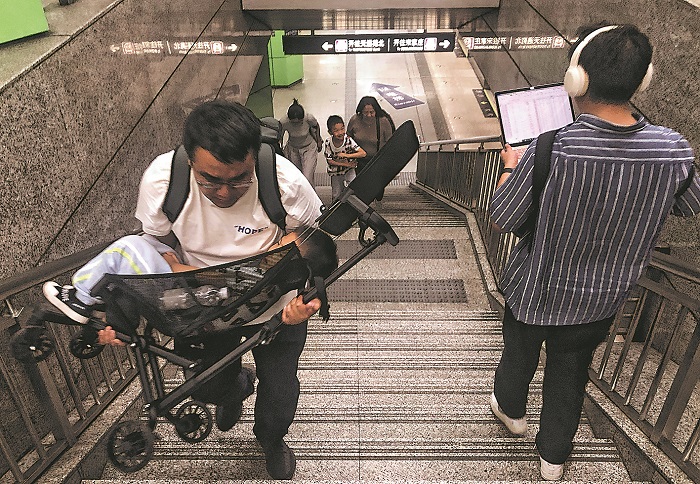 5月29日晚,北京一地鐵臺階處,右側是邊走邊用電腦處理工作的年輕男子,左側是抱著嬰兒車和孩子的年輕父親。一邊是事業,一邊是家庭,他們在夜晚的地鐵站擦肩而過。本報記者 楊登峰 攝