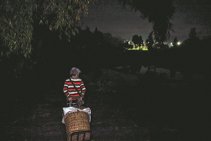 4月13日6時,重慶市渝北區石船鎮石龍村,王貴英用小推車拉著背簍走向重慶地鐵4號線石船站,準備乘坐“背簍專線”去城里賣菜。本報記者 蔚可任 攝