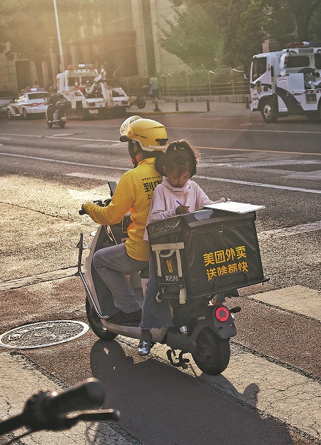 6月26日,來自東北的張寧帶著孩子送外賣。張寧母子2023年來京,她希望孩子今后能在北京上小學,她來掙錢養家。本報記者 楊登峰 攝