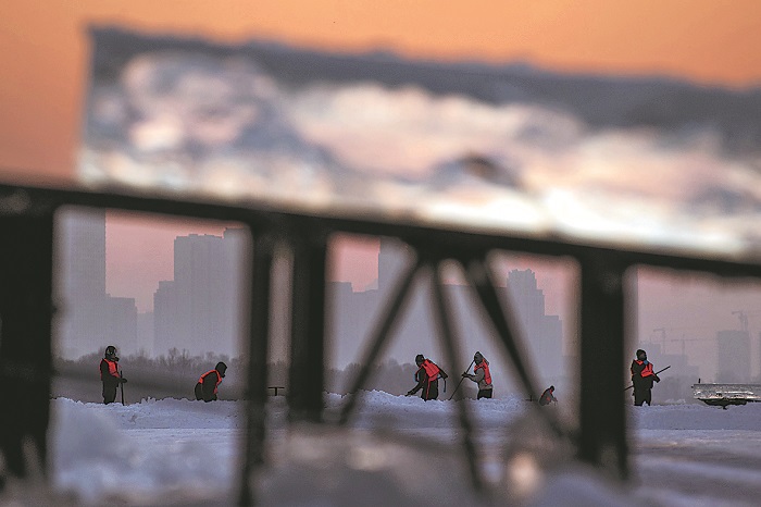 12月9日,在哈爾濱松花江上,職業采冰人冒著約零下20攝氏度的嚴寒開展采冰作業,滿足冰雪大世界的用冰需求。隨著第九屆亞冬會的臨近,哈爾濱冰雪季的用冰量持續增加。本報記者 吳凡 攝