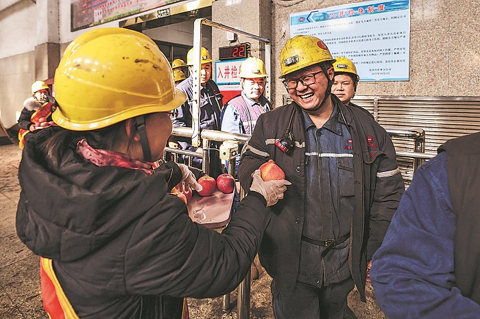 2月12日,大年初三,在河北唐山開灤范各莊礦井口,協管員為即將下井的礦工遞上蘋果。本報記者 蔚可任 攝