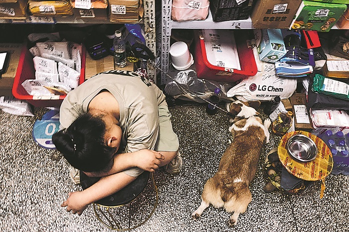 8月30日,江蘇省南京市鼓樓區一菜鳥驛站內,工作人員和她的狗狗在午休。本報記者 劉金夢 攝