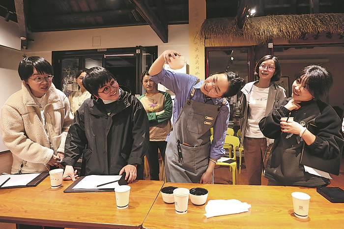 3月31日晚,在南京市玄武區小紅梅信仰生活空間,“辛苦咖”夜校專場活動正在進行。班主任小辛(右三)帶領大家“喝門道”,對咖啡風味進行品飲、識別和探索。本報記者 劉金夢 攝
