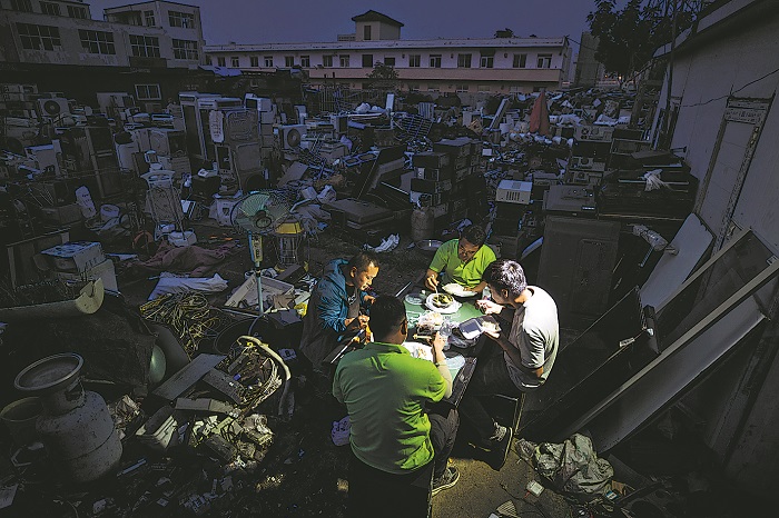7月3日,山東青島,忙碌了一天的家電回收員在回收站的空地上吃晚飯。本報記者 王偉偉 攝