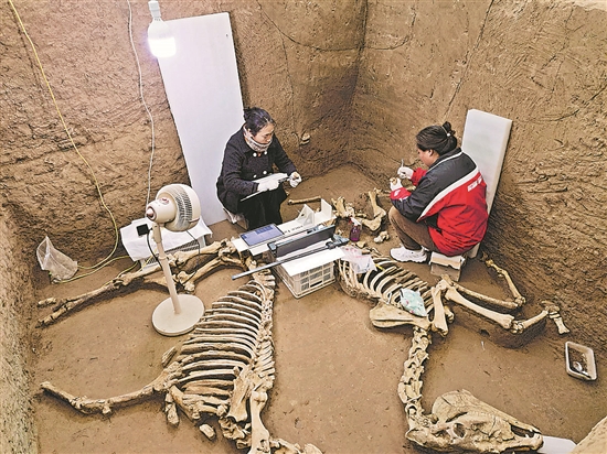 圖為2024年11月6日考古工作人員清理祭祀坑出土的馬骨。中新社發 中國社會科學院考古研究所安陽工作隊 供圖