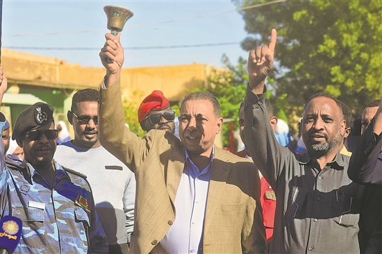 圖為當(dāng)?shù)貢r間12月28日,在蘇丹北方州棟古拉市一處考點(diǎn),北方州州長阿卜丁·阿瓦達(dá)拉搖鈴示意證書考試開始。