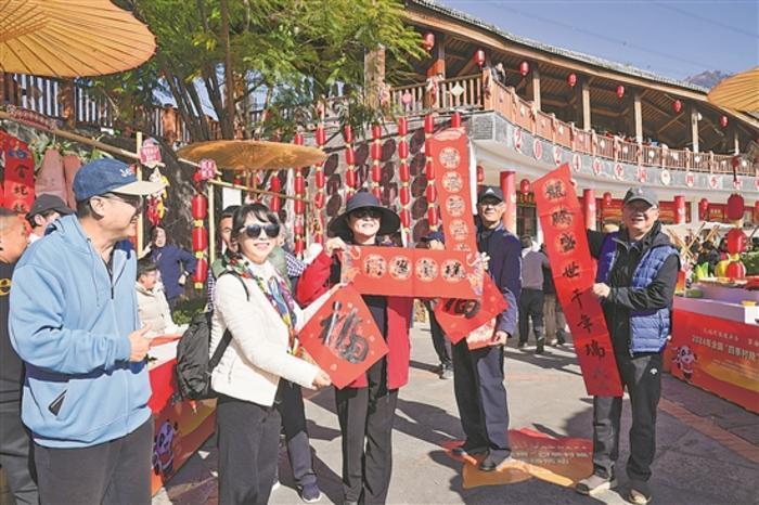 12月30日,游客在鄉(xiāng)村年貨大集上展示春聯(lián)。