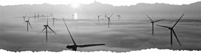 山東榮成,海上風電場日出時分云霧飄渺,宛如仙境。視覺中國 供圖